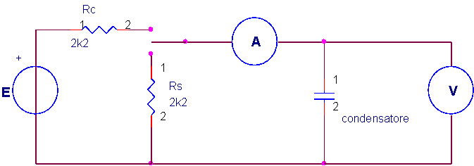 DESCRIZIONE DELL'ESPERIENZA: in questa prova osserveremo la variazione di tensione e di corrente nel processo di carica e di scarica del condensatore, applicando nel circuito una resistenza di carica di 2.2KW ed una resistenza di scarica di 2.7KW. Tramite multimetro digitale misureremo i valori sul condensatore e li riporteremo in un grafico rappresentante la carica Q del condensatore, per analizzarne la sua variazione.