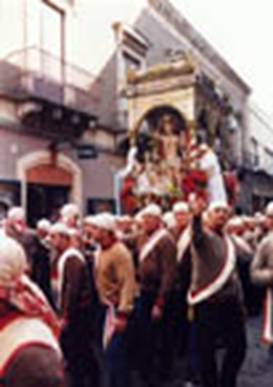 E' uno spettacolo di fede popolare intensa,ma anche un poema di colori di rilevante valore folcloristico, all'ombra di una delle più belle chiese barocche,la basilica del Santo, arricchita dagli affreschi del massimo pittore acese del '700, Pietro Paolo Vasta. I "divoti", poi, rappresentano una tradizione nella tradizione, quasi una corporazione di stampo medioevale arrivata sino a noi sulle ali del tempo: quello del "divoto" è, infatti un "mestiere"che si tramanda di generazione in generazione e di padre in figlio, tra le categorie dei pescivendoli, dei rivenditori di frutta e verdura e "cicirari"cioè dei venditori di ceci abbrustoliti,noccioline americane e altre sementi infornate,che mettono su bancarelle in occasione delle varie feste cittadine religiose e non. E' un "mestiere" che richiede una competenza specifica,nata da una lunga esperienza, perché è difficile e assai pericoloso fare eseguire "a regola d'arte" al pesantissimo fercolo (o alle antiche e pesanti candelore in legno in occasione della festa in onore della patrona Santa Venera)alcune tipiche,spericolate e rapide manovre che costituiscono i pezzi forti dell'esibizione e, insieme, i "do di petto" della tradizione che vanno dalla famosa " discesa", al momento dell'uscita dalla basilica alla pericolosa "entrata" del fercolo all'interno della chiesa.E' uno spettacolo di fede e religiosità, al quale assiste una immensa folla col cuore in gola, con la stessa intensa emozione con cui il popolo assisteva agli spettacoli del circo massimo, al