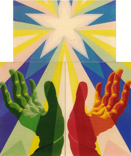 DESCRIZIONE: disposta su tre pannelli, l'immagine comporta in alto una stella radiante, dipinta a toni pastello, e in basso due mani aperte a coppa, trattate con colori netti, e vivaci. Rosso e verde, i due colori complementari della bandiera italiana, i quali rispondono al blu profondo sul quale si stacca la stella. Quest'ultima è il simbolo nazionale italiano di cui le mani raccolgono la manna o la luce o la scienza o la spiritualità secondo la metafora che si vuol vedere nell'immagine. Balla ottiene l'effetto ambiguo di un piano unico ponendo la stella in secondo piano, ma facendo scendere i suoi raggi luminosi sulle mani dipinte in primo piano. Le forme sono espressive e schematiche, trattate come in un manifesto murale o nell'arte di propaganda di massa. La stella è disegnata con una progressione in avanti tramite quattro profili l'uno nell'altro in modo da restituire una figura geometrica complessa con l'immediata semplicità della grafica pubblicitaria. Solo per la stella, Balla ha utilizzato cinque colori diversi con campiture scintillanti che, malgrado la dissonanza di un rosa con punte eteree e luminose, fanno pensare alle più recenti innovazioni tecniche della pittura europea o americana.