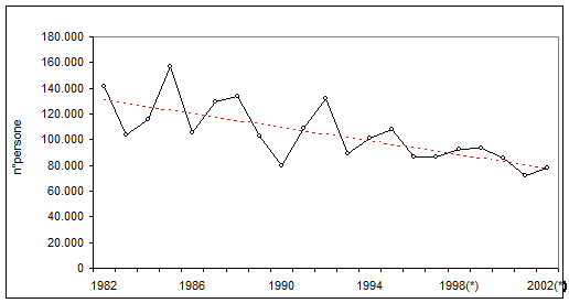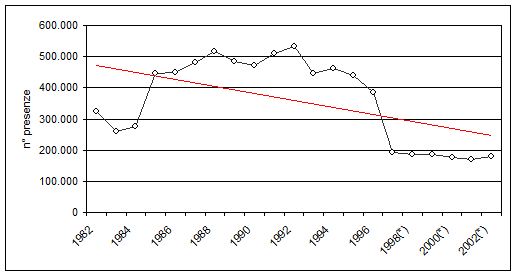 Dall'analisi della serie storica degli arrivi e delle presenze di turisti all'Abetone dal 1982 al 2002 si può osservare che l'andamento interannuale del fenomeno presenta una sensibile tendenza alla diminuzione (fig. 3). Dal 1982, durante il quale si registra una presenza di turisti italiani e stranieri pari a 141.136 unità, si arriva alle 77852 unità del 2002. Il massimo principale delle presenze viene registrato nel 1985 con 156685 unità e il minimo assoluto nel 2001 con 72053 unità. Il grafico mostra alcune significative fluttuazioni: dopo il picco massimo storico nel 1985 negli anni successivi si verifica una brusca diminuzione delle presenze, che nel 1990, con 79.416 unità, raggiunge il minimo storico secondario. Dal 1990 si ha un leggero e progressivo aumento di turisti fino al 1995 (108.015), dopo il quale si ha una nuova inversione di tendenza, fino al minimo assoluto di presenze registrato nel 2001 ( Fonte: Ufficio Turismo e dell'Ufficio Statistica del servizio Programmazione, Statistica e Attività Produttive Extragricole della Provincia di Pistoia).