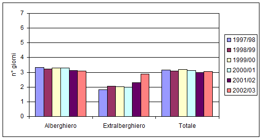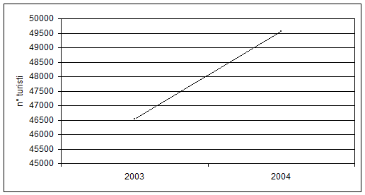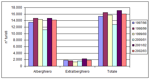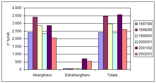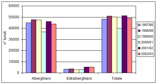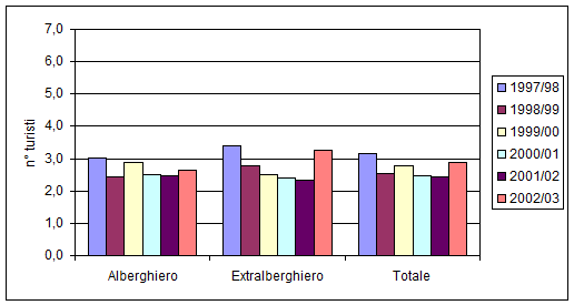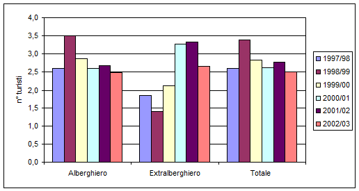 La permanenza media nel complesso rimane costante su tre giorni con una diminuzione nelle strutture alberghiere ed un aumento notevole (1 giorno in più in media) in quelle extralberghiere. Nel 2002 l'alberghiero, rappresentando circa l'89% degli arrivi e delle presenze, è alla base della diminuzione generale (-3,47% arrivi, -4,57% presenze) mentre per l'extralberghiero la variazione sul 2001 è molto negativa per gli arrivi (-21,86%) e meno negativa per le presenze (-2,51%). Nel 2003 i dati a nostra disposizione non ci permettono di fare un raffronto corretto con il 2002 perché viene preso in considerazione il periodo gennaio-giugno. Il flusso turistico alberghiero registra una variazione di -0,54% di arrivi e -2,38% di presenze, si segnano anche variazioni negative per l'extralberghiero, -19,86% di arrivi e -7,54% di presenze. Nel gennaio-marzo 2004 il flusso turistico torna ad avere valori positivi, nelle strutture alberghiere si hanno 19,83% di arrivi e 21,92% di presenze . è soprattutto nelle strutture extralberghiere che si registra l'incremento maggiore del flusso turistico, 81,73% di arrivi e 132,43% di presenze.