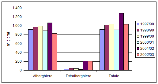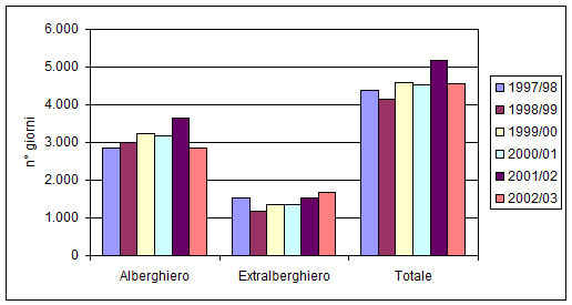 Molto alta anche nel periodo invernale l'affluenza nelle strutture ricettive extralberghiere (37% arrivi; 42% presenze), che mostrano per quest'anno i valori maggiori dal 1997 (1.686 arrivi, +9,98% sul 2001/02; 5.485 presenze, +54,42% sul 2001/02), con una permanenza media di 3,3 giorni rispetto a quella di 2,7 giorni delle presenze alberghiere, per un totale di 2,9 giorni di permanenza media complessiva (fig. 6a, 6b, 6c).