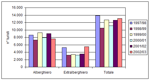 Al picco positivo che ha contraddistinto i primi anni Novanta (nel 1992 si sono registrati totali pari a 69.064 arrivi e 559.908 presenze ed una permanenza media superiore agli 8 giorni), ha fatto seguito, una progressiva contrazione dei valori, evidentissima già nel 1993 e riconducibile alla crisi economica prodotta dalla svalutazione della lira. Dal 1994 il totale degli arrivi ha riportato un andamento tendenzialmente crescente, arrestandosi leggermente nel 1996; ancora più breve la fase positiva registrata dal totale presenze, in discesa già dal 1995. Netto e deciso appare invece il calo riportato da entrambi i valori fra il 1996 ed il 1997 (-24,27% negli arrivi, -51,74% nelle presenze): un fenomeno che evidenzia in tutta la sua portata l'impatto prodotto dal cambiamento della classificazione delle strutture ricettive e che trae conferma dall'analisi del comportamento delle componenti alberghiera ed extralbeghiera in cui si articolano i dati complessivi.