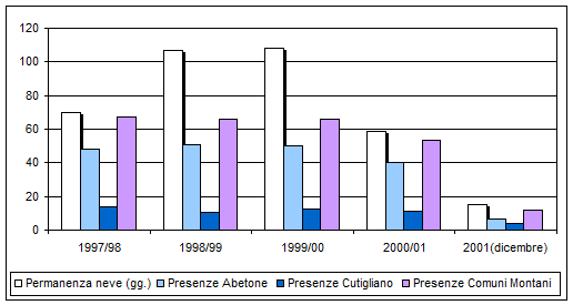 Fig. 9 - Permanenza della neve al suolo confrontata con il numero di turisti sulla montagna pistoiese (1997-2001).