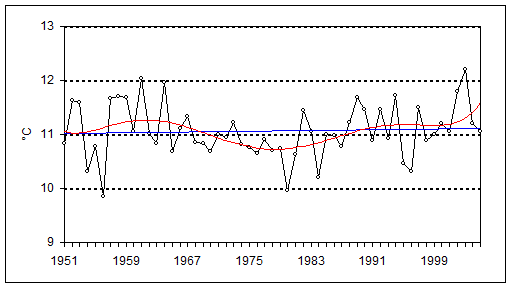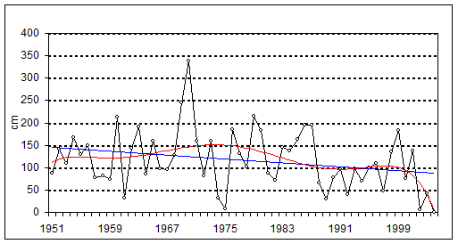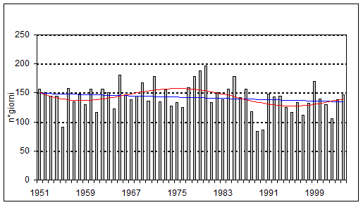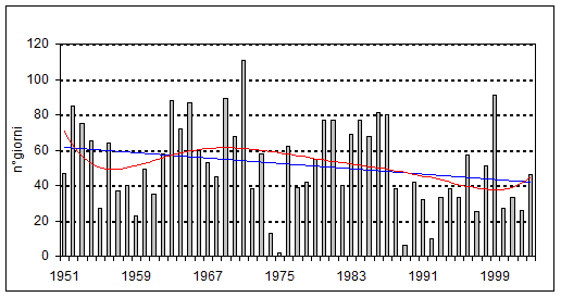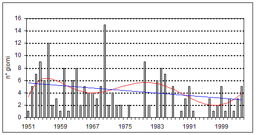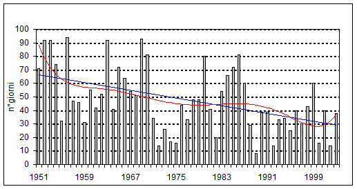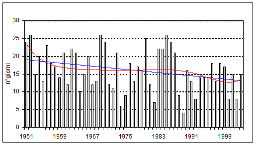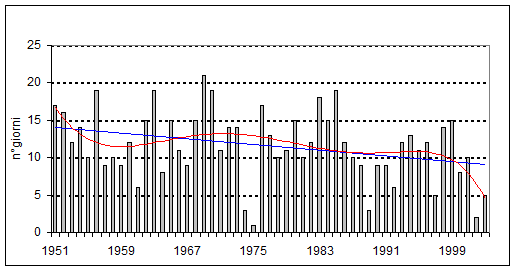 L'andamento interannuale del numero di giorni di precipitazione nevosa, pur considerando alcune interruzioni nella raccolta dei dati, evidenzia nel complesso una sensibile tendenza negativa. Dalla figura 14 si possono notare fluttuazioni positive come negli anni Cinquanta e variazioni negative verificatesi negli anni Sessanta e Novanta. Negli ultimi due anni del periodo considerato si sta assistendo ad una lenta crescita del numero di giorni di precipitazione nevosa.