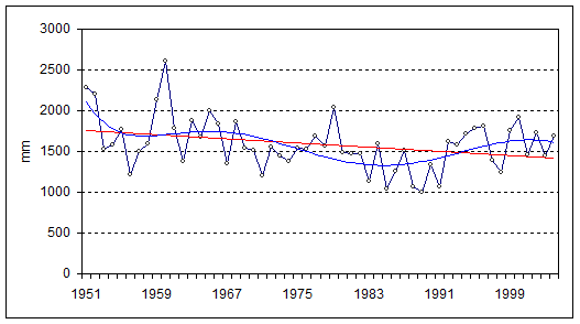 Fig. 13.-.Andamento interannuale delle precipitazioni a Boscolungo (1951-2004).