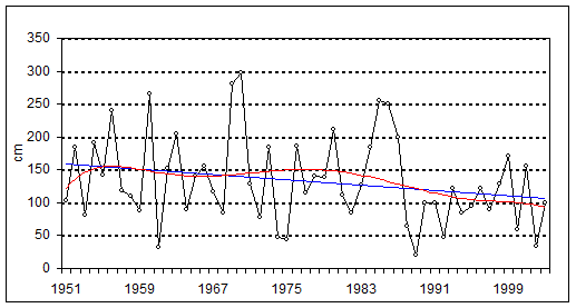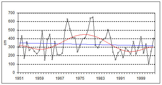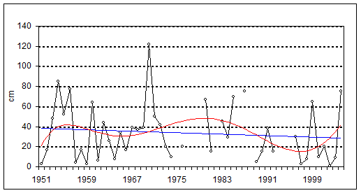 Fig. 24 - Andamento interannuale dell'altezza di neve caduta a Boscolungo (1951-2004)
