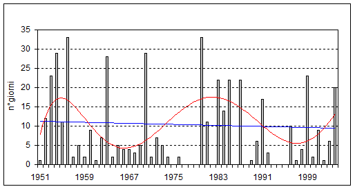 Fig. 14 - Andamento interannuale del numero di giorni di precipitazione nevosa a San Marcello Pistoiese (1951-2004)