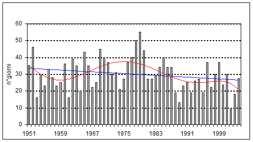 L'andamento interannuale del numero di giorni con precipitazione nevosa mostra una lieve tendenza negativa e alcune fluttuazioni positive e negative che anno interessato rispettivamente gli anni Settanta e gli anni Cinquanta e gli ultimi venticinque anni, pur in presenza in quest'ultimo periodo dal 1989 al 1999 di una fase interessante di crescita, seguita però da un netto calo di giorni con precipitazione nevosa negli ultimi cinque anni, culminata nel 2002 (fig. 23).